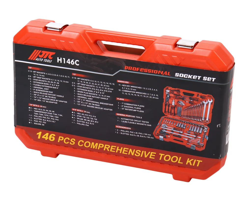 JTC-H146C - Набор инструментов 146 предметов слесарно-монтажный 1/2",1/4" 6-ти гран.в кейсе JTC - купить на сайте официального представителя в интернет-магазине Магазин «JTC СПб». На весь ассортимент есть необходимые сертификаты качества и действует гарантия поставщика. Цена указана за 1 шт. Оптовым покупателям дополнительные скидки.
