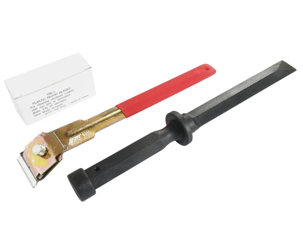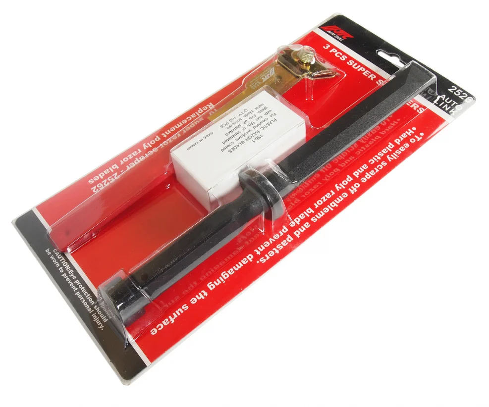 Скребок с пластиковыми лезвиями позволяет производить работы, не повреждая поверхность.