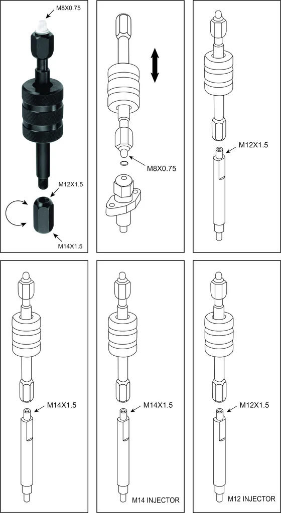 Резьба: М8х0,75, М12х1,5 для форсунок Bosch; М14х1,5 для грузовиков Volvo, Scania.