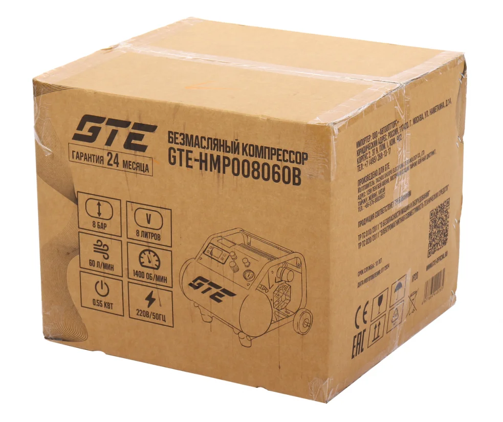 - Компрессор поршневой безмасляный 220В, ресивер 8 л, 60 л/мин., GTE-HMP008060B – линейка поршневых безмасляных компрессоров с низким уровнем шума и внушительной, для своих габаритов, производительностью.