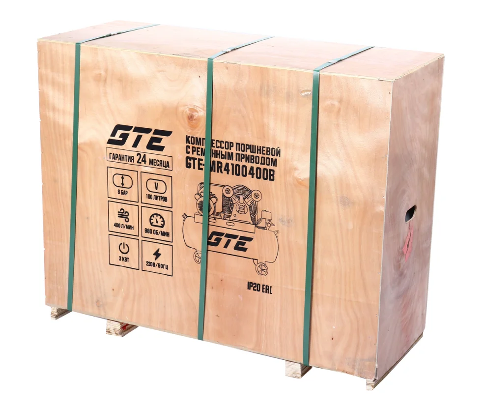 - Компрессор поршневой ременной 220В, 400л/мин., ресивер 100л., одноступенчатый, GTE-MR4100400B отличается простотой и надёжностью конструкции, высокой ремонтопригодностью и оптимальным соотношением цены и качества.